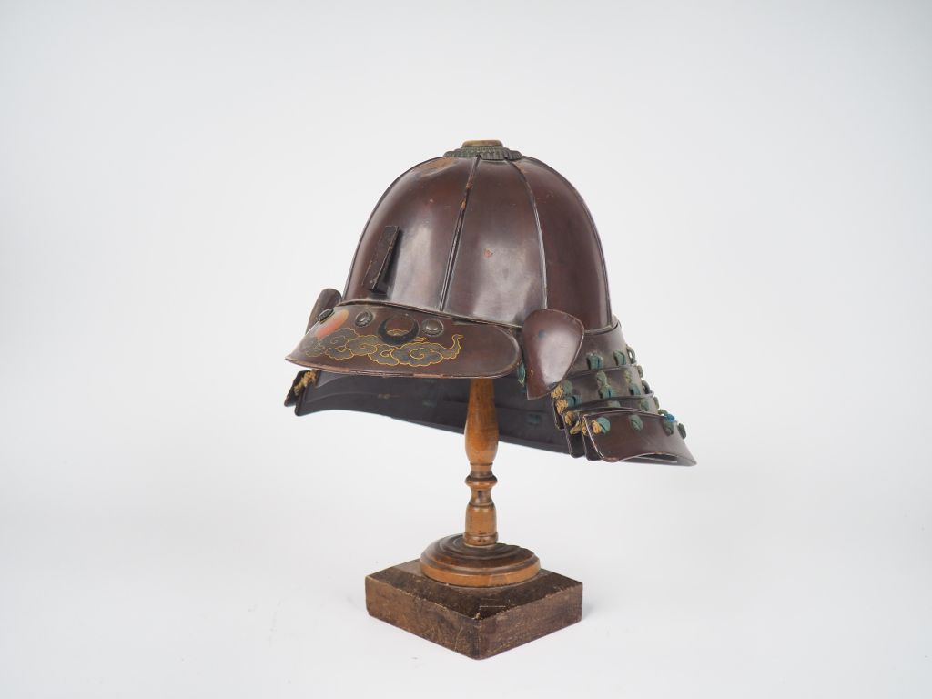 Japon, XVIIe - XVIIIe siècle, Casque SUJI-BACHI KABUTO à huit plaques en fer laqué brun, couronné d'un tehen kanamono à trois niveaux de chrysanthèmes, la visière mabezashi à décor laqué or et noir figurant le soleil et la lune sur des nuages gris-argent, laquée rouge au revers , le shikoro de type hineno-shikoro, à cinq plaques laquées brun reliées par laçage en sugake-odoshi bleu, la plaque supérieure terminée par deux petits fukigaeshi en ses extrémités. L’intérieur du kabuto doublé de textile bleu. (Lacunes de laque et enfoncements sur le casque , soulèvements et lacunes de laque sur le shikoro) H. bombe : 14,5 cm – Prof. Bombe : 26 cm