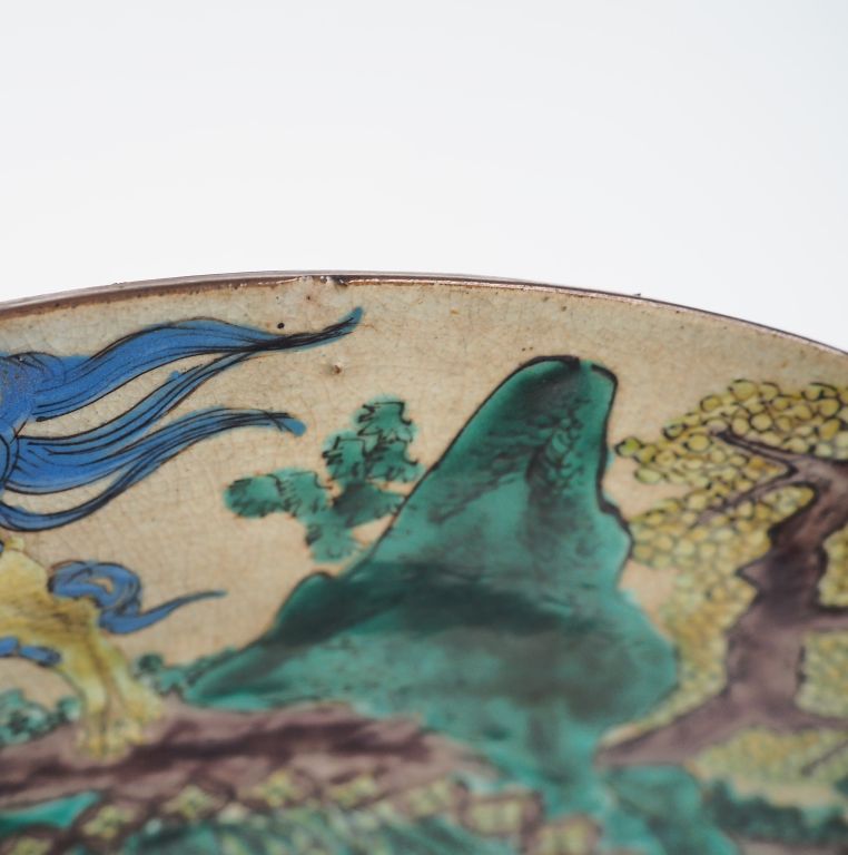 Japon, XVIIe - XVIIIe siècle, Ôzara (Grand plat) en grès de type Ko-kutani, à décor, émaillé en vert, jaune, manganèse et bleu, en médaillon central, du sage taoïste Gama Sennin, faisant face à un crapaud au bord d’un cours d’eau , l’aile ornée d’un paysage lacustre et montagneux animé de trois shishi, l’un jaune et bleu, et les deux autres verts et manganèse , le revers de couleur verte orné de motifs floraux, la base jaune décorée de branchages avec une marque Fuku sur fond vert. Diam. 44,5 cm x Haut. 9 cm (Quelques éclats, notamment sur les bords, usures, salissures , fêle sur le rebord de la base , une trace d’étiquette ancienne sous la base)