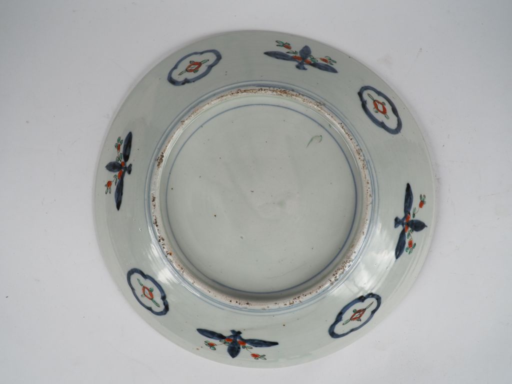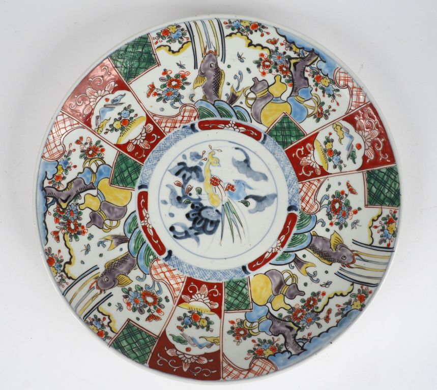 Japon, XXe siècle, Plat en porcelaine d’imari à décor en médaillon central et décor rayonnant. D. 40 cm