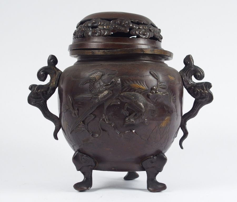 Jardinière en bronze à patine brun rouge, reposant sur 3 pieds zoomorphes, décor de dragons. Japon fin XIXème. H. : 31 cm (fond manquant)