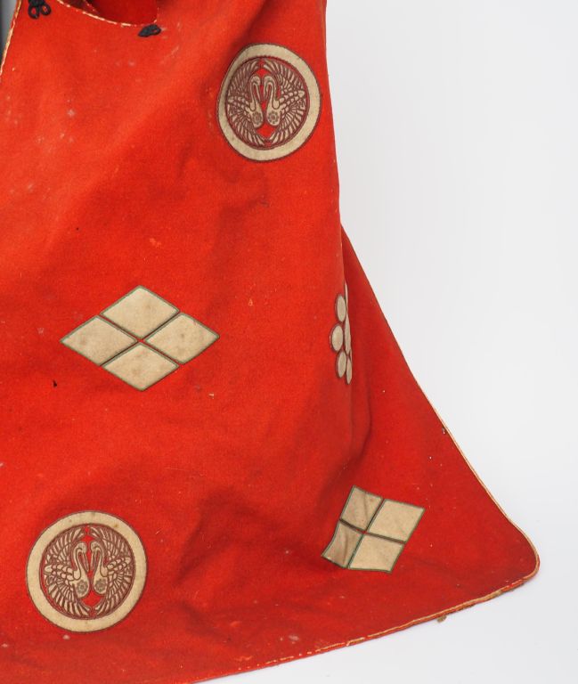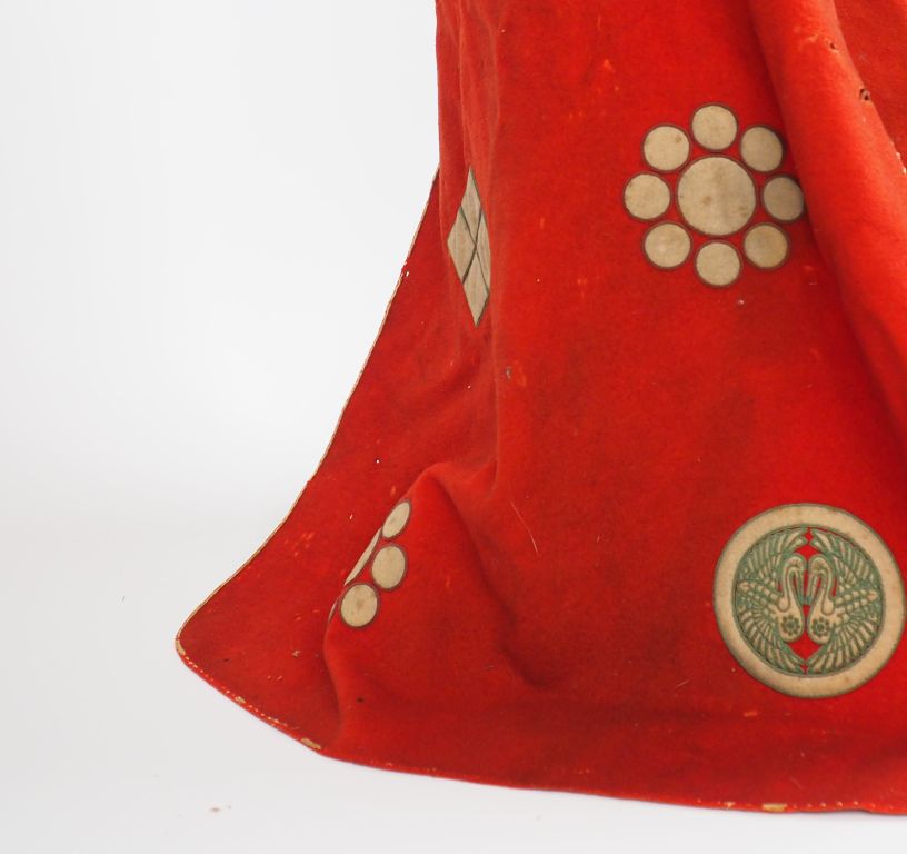 Kaji kabuto, casque de pompier, avec sa cape, le casque de type suji-bashi, laqué brun, les côtes et les bords soulignés d’un filet doré, deux fukigaeshi encadrant la visière , la cape en feutre rouge rehaussée de plusieurs Mon se détachant en blanc. Japon, XIXème siècle. H. cape : 67 cm (lacunes de laque et accidents sur le casque, fukigaeshi à refixer , cape tachée, trouée)