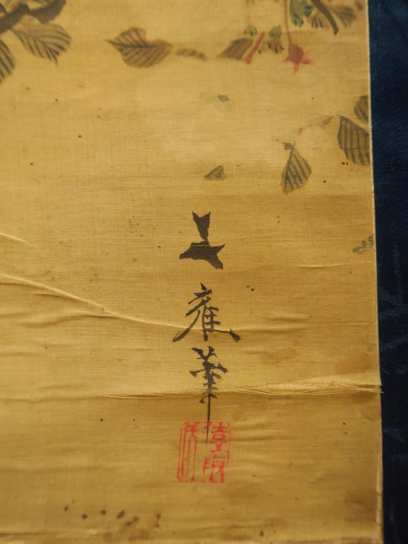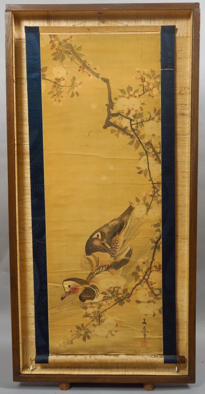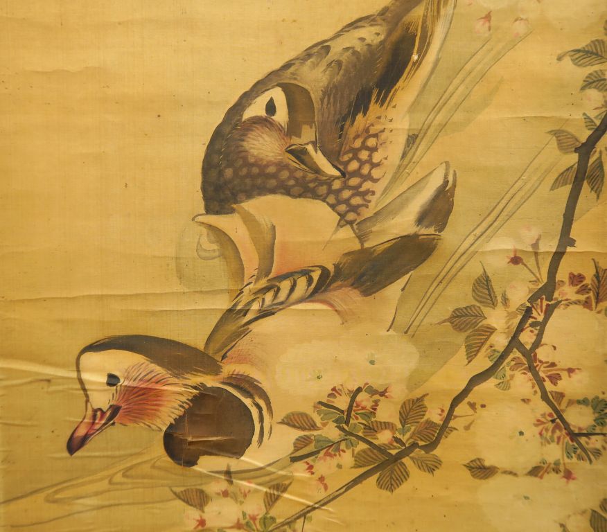 Kakemono au lavis et couleurs sur soie représentant un couple de canards mandarins dans un cours d’eau, auprès d’un cerisier en fleurs. Signé Bun’yô Japon, XIXème siècle. (Usures et petits accidents) Dim. à vue : 95 x 34,5 cm.