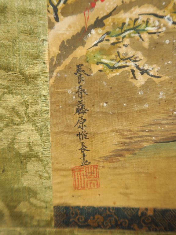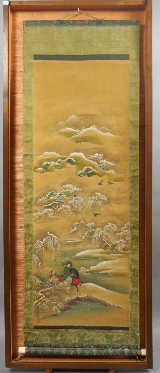 Kakemono au lavis et couleurs sur soie représentant un jeune homme à cheval suivit de son serviteur portant son sabre, voyageant dans un paysage de neige où montagnes et arbres émergent de nuages. Signé Yôshun Fujiwara Ichô ? Japon, fin XVIIIe-XIXe siècle (Usures, plis, taches) Dim. 107 x 38 cm.