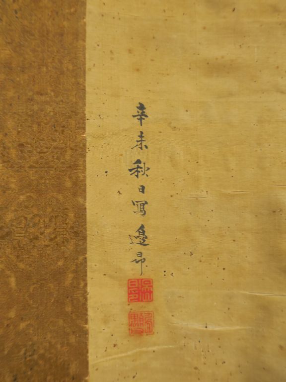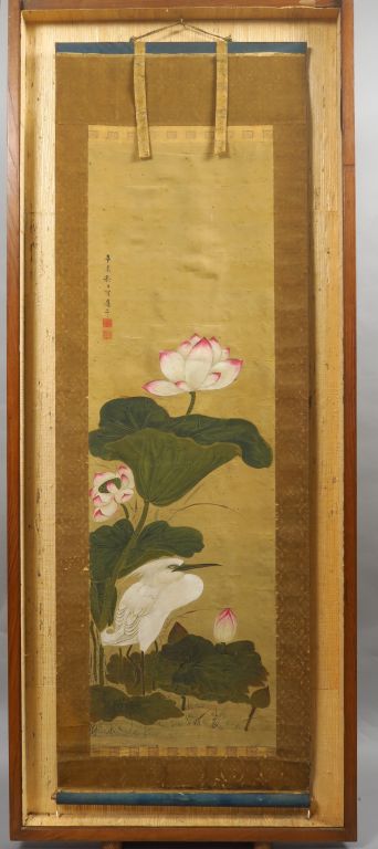Kakemono peint couleur sur soie représentant un héron blanc se tenant auprès de grandes feuilles et fleurs de lotus. Signé Henkô (possiblement Watanabe Sekisui, 1775-1833) Avec titre : Kôrai Shujitu, « le bonheur vient d’un jour d’automne » Japon, fin XVIIIème - début XIXème siècle (Usures, quelques déchirures) Dim. 104 x 31,5 cm.