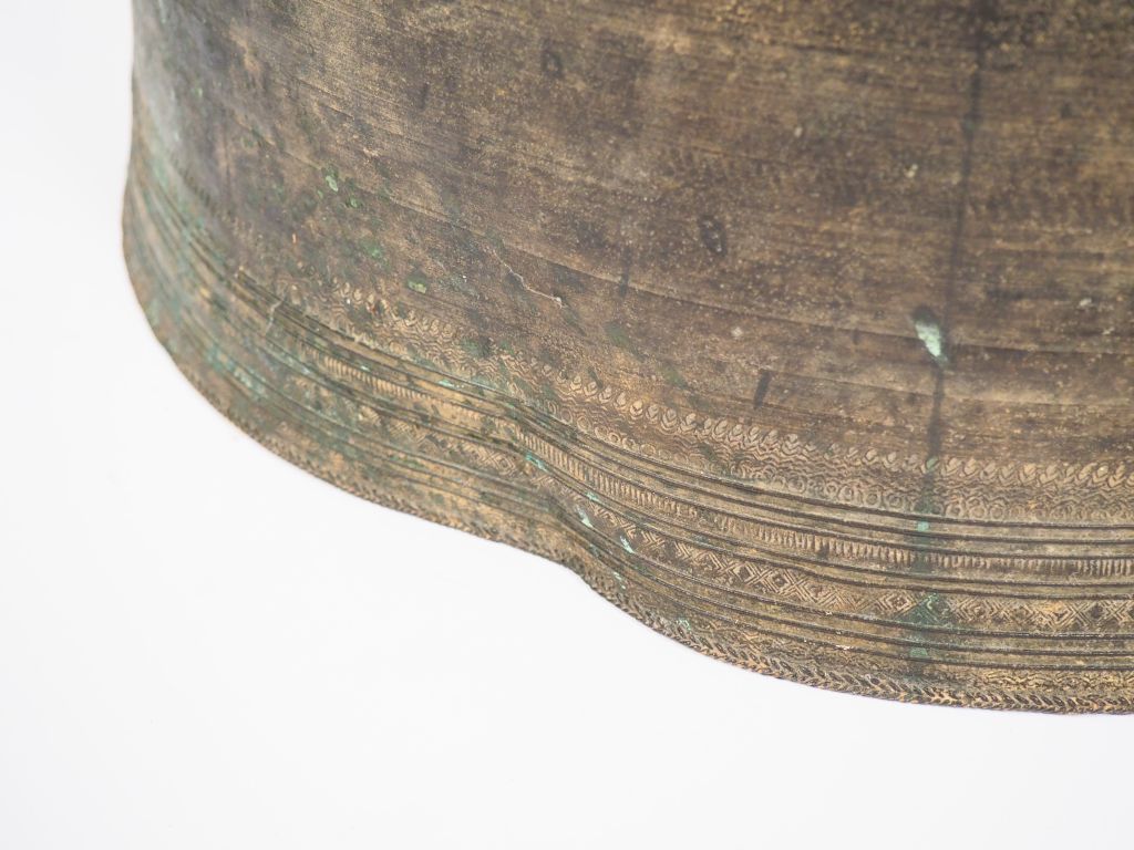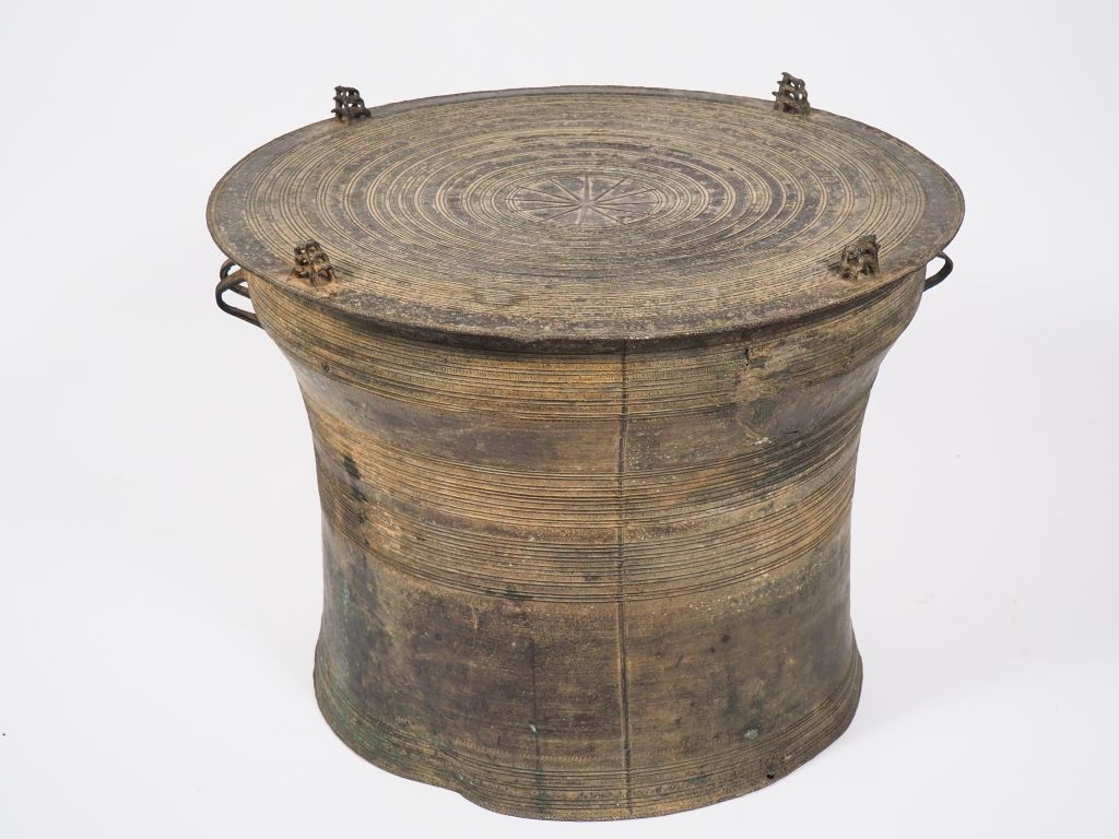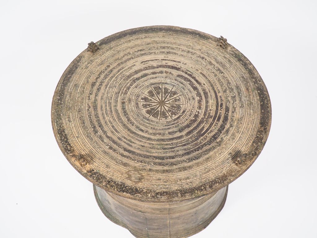 Laos XVIIIe siècle, Tambour de pluie en bronze de forme circulaire à décor de motifs géométriques et rayonnant, surmonté de quatre grenouilles en applique. H. 50 cm