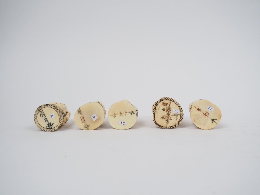 Lot comprenant cinq tabatières en os prenant la forme de personnages. H. 8 cm et 9 cm (manque un couvercle)