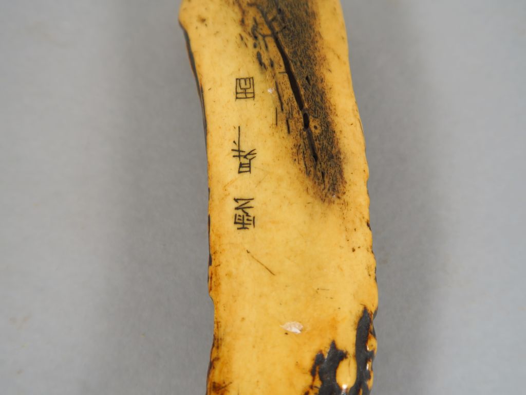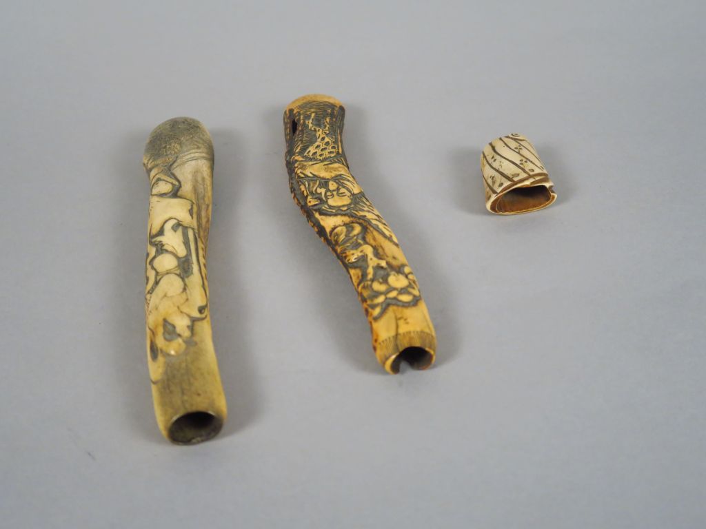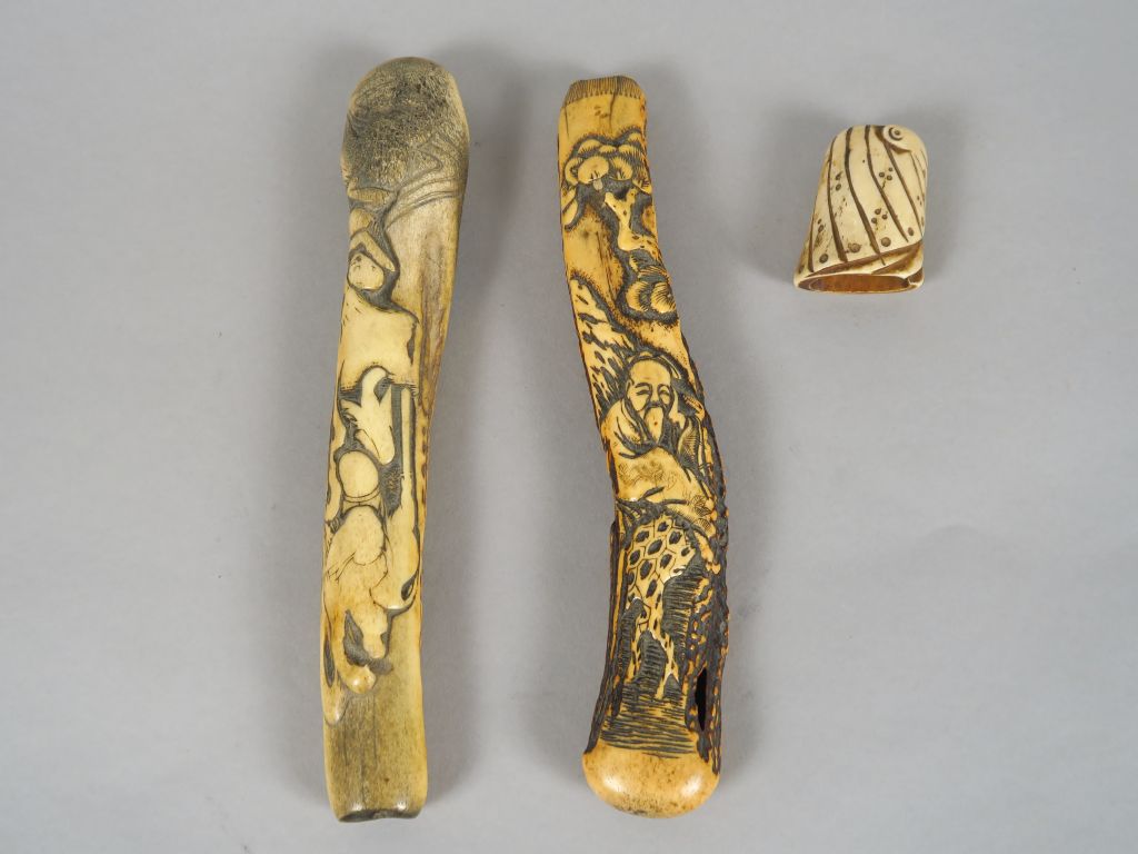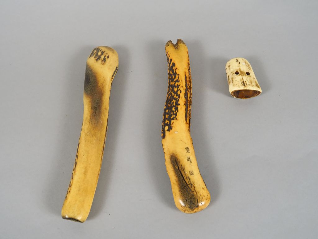 Lot comprenant deux étuis à pipe Kizerusutzu en corne de cerf, à décor d'un ermite dans une montagne avec pins de longévité. Long. 19,5 cm environ On y joint un netsuké en corne de cerf. Long. 4,2 cm Japon, vers 1900