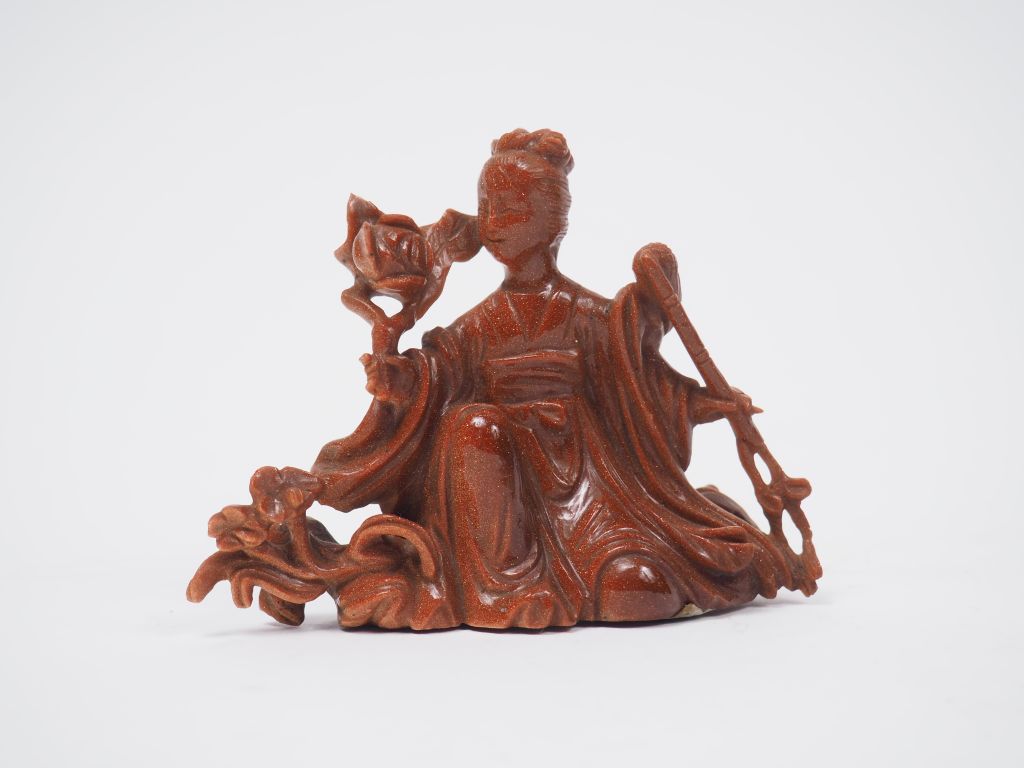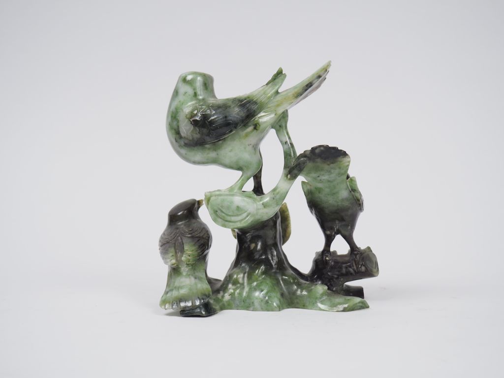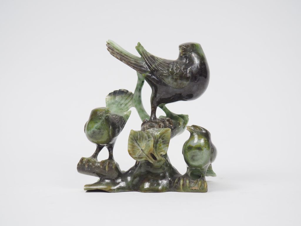 Lot comprenant : - groupe en serpentine représentant trois oiseaux - statuette en aventurine représentant une déesse du printemps. H. 16 cm et 8 cm