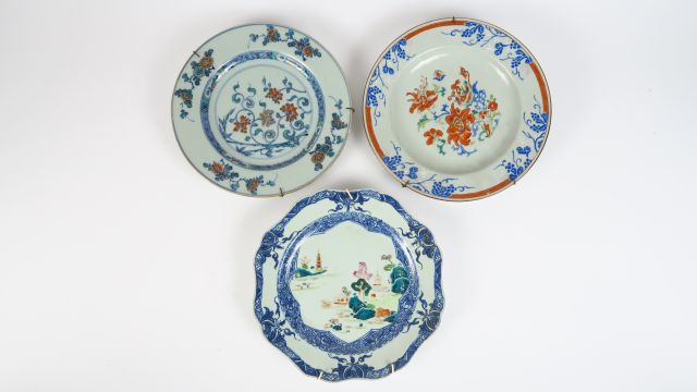 Lot comprenant trois assiettes en porcelaine famille rose pour l'une décor de paysage lacustre, l'autre en porcelaine Ducai décor floral. Chine période Qianlong Diam. 22 et 22,5 cm