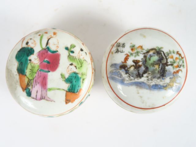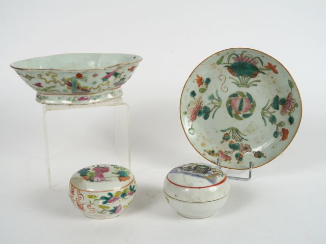 Lot comprenant : un ravier, une coupe et deux boites couvertes en porcelaine de la famille rose, à décor de personnages, objets mobilier, fleurs et végétaux. Chine, fin XIXème - début Xxème. Diam. 8 à 18 cm