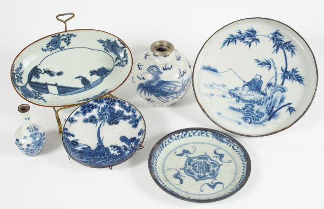 Lot de 4 coupes, un petit globulaire et un vase en porcelaine de Hue bleu blanc, Indochine XIXème. Diam. 10 à 17 cm. H. du vase : 8 cm (quelques petites égrenures, une coupe accidentée)