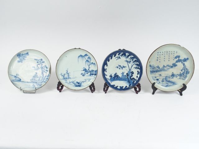 Lot de quatre coupes en porcelaine bleu blanc de Hue, l’une à décor d’un dignitaire et son serviteur avec poème faisant « l’éloge du lotus » avec marque apocryphe Yongzheng , une coupe à décor d’un pêcheur sur un arbre avec marque apocryphe Yongzheng , une coupe à décor d’un diable qui supplie un dignitaire , une coupe à décor de deux daims sous des bambous avec marque He Ming. Hue, XVIIIe siècle (Accidents) Diam. 17,6 à 20,5 cm