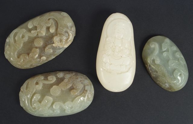 Lot de quatre pendentifs ou éléments en jade ou serpentine, à décor de dragons et de guanyin. Chine XXème siècle. L. : 6 à 8,5 cm