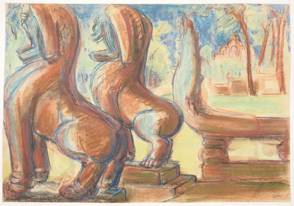 Louis Robert BATE (1898-1948, grand prix de l'Indochine en 1938). "Architectures à Angkor". Couleurs sur papier, signé en bas à droite. Dim. 32,5 x 47 cm.
