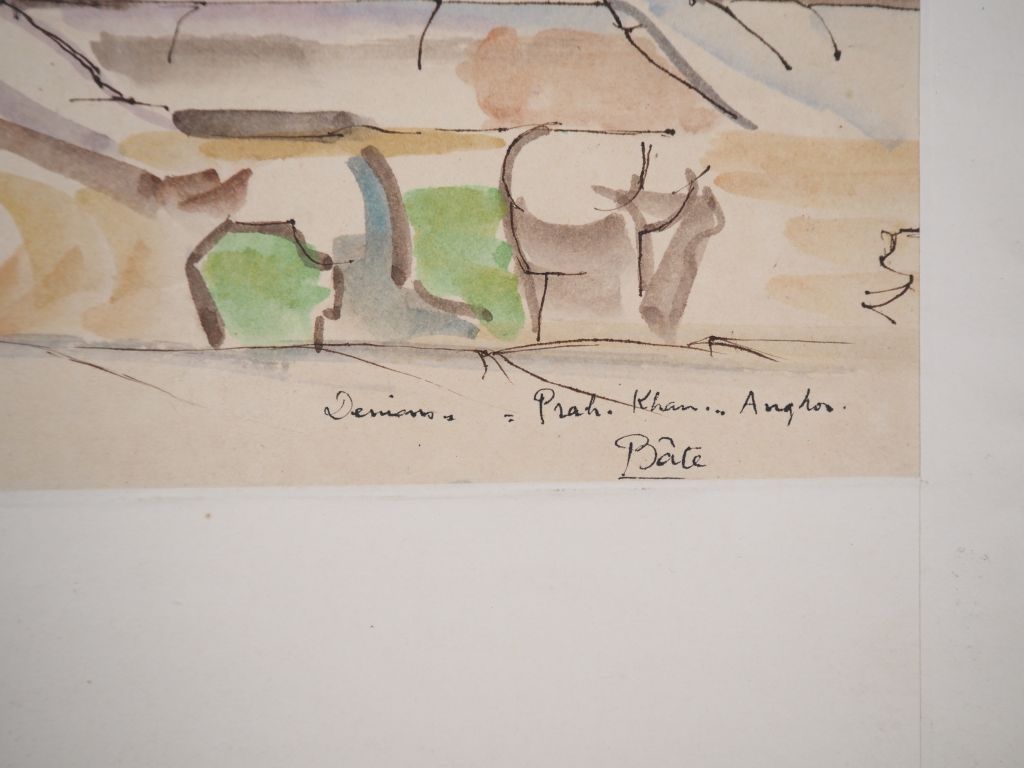 Louis Robert BATE (1898-1948, grand prix de l'Indochine en 1938). "Divinités sculptéS à PrEah Khan Angkor". Aquarelle signée et située en bas à droite. Dim. 20 x 62 cm.
