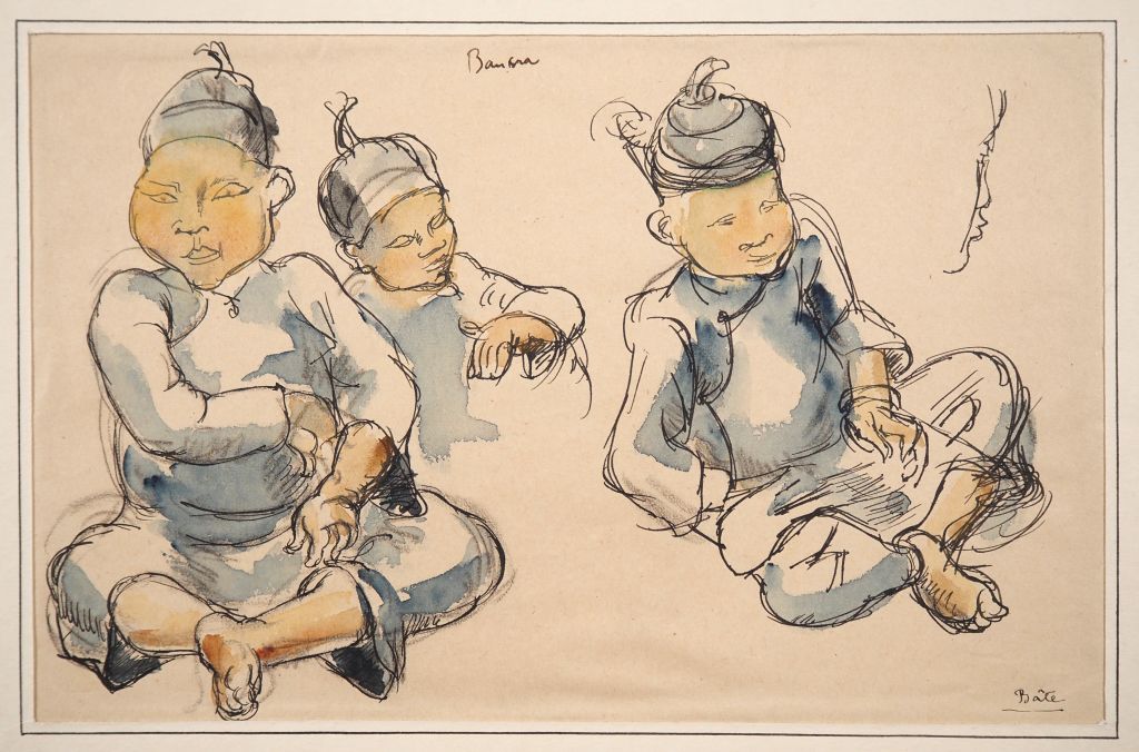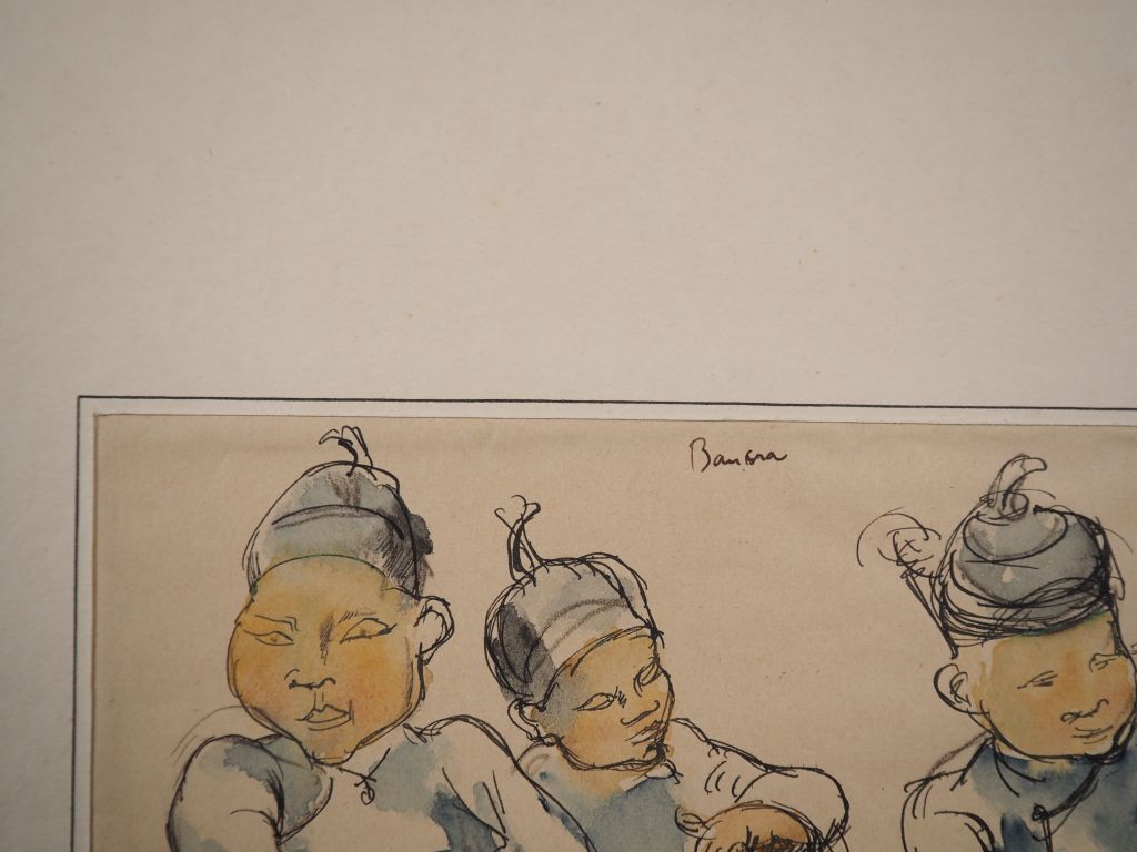 Louis Robert BATE (1898-1948, grand prix de l'Indochine en 1938). "Enfants chinois" Encre et aquarelle sur papier signée en bas à droite. Dim. 13 x 20 cm.
