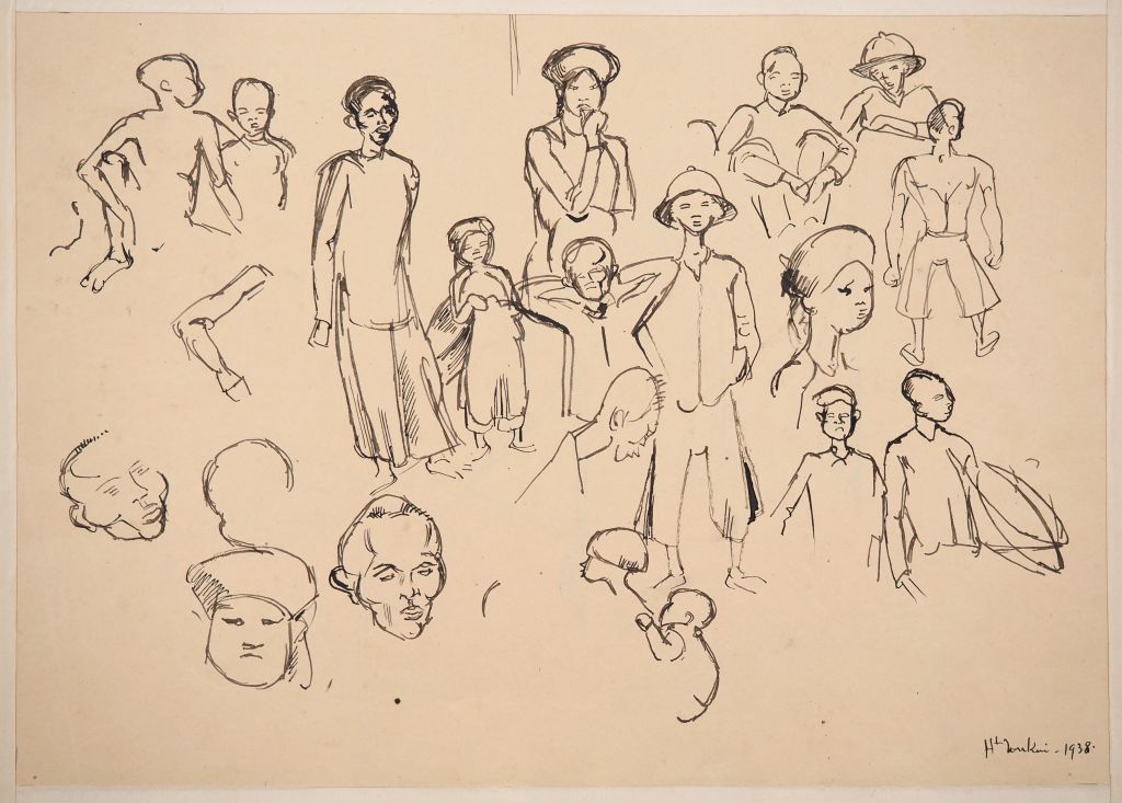 Louis Robert BATE (1898-1948, grand prix de l'Indochine en 1938). "Etude de personnages du Haut-Tonkin". Encre sur papier signée et située en bas à droite, datée 1938. Dim. 22,5 x 32 cm.