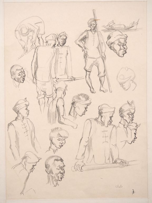 Louis Robert BATE (1898-1948, grand prix de l'Indochine en 1938). "Etude de travailleurs indochinois". Encre et crayon sgné en bas à droite. Dim. 28 x 20 cm.