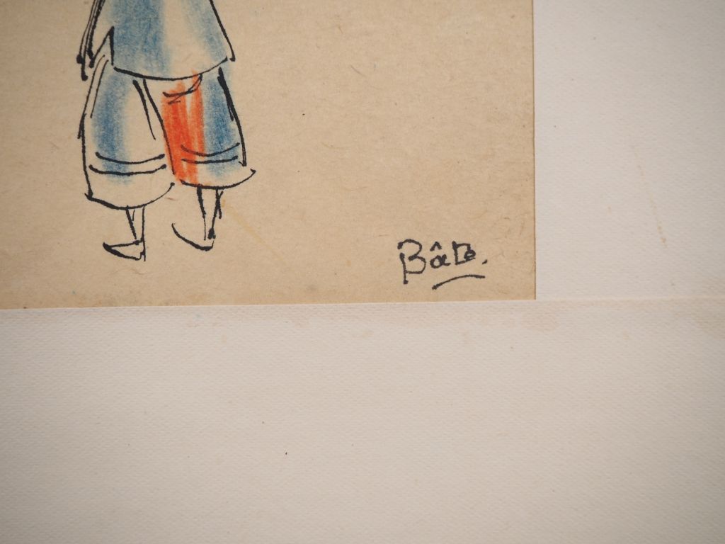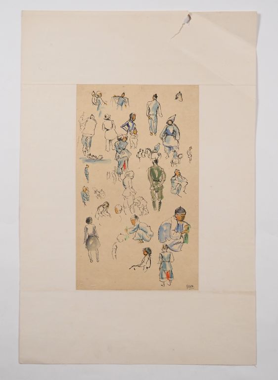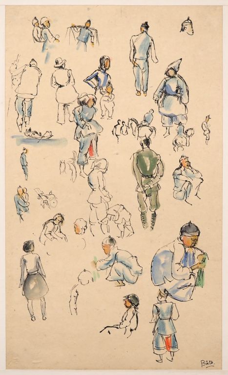 Louis Robert BATE (1898-1948, grand prix de l'Indochine en 1938). "Etude de personnages chinois". Encre et couleurs sur papier signée en bas à droite. Dim. 33,5 x 20 cm.