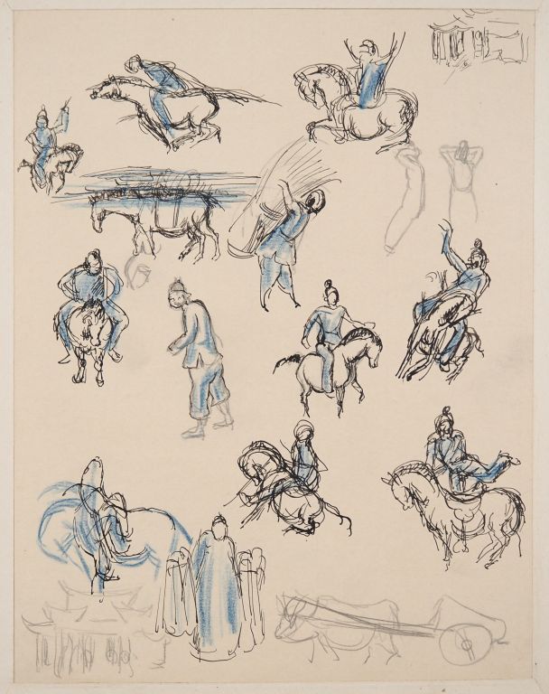 Louis Robert BATE (1898-1948, grand prix de l'Indochine en 1938). "Etude de cavaliers chinois". Encre et couleurs sur papier. Dim. 26,5 x 20,5 cm.