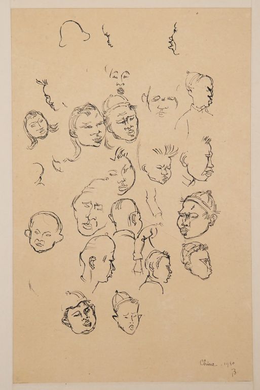 Louis Robert BATE (1898-1948, grand prix de l'Indochine en 1938). "Etude de têtes de personnages chinois". Encre sur papier signée en bas à droite et datée 1940. Dim. 30 x 19 cm.