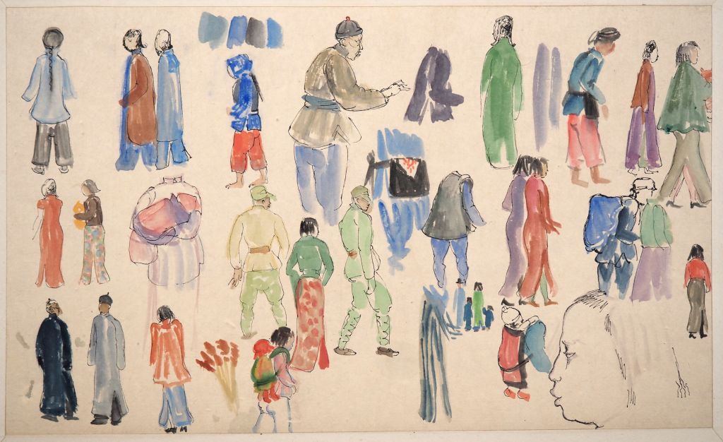 Louis Robert BATE (1898-1948, grand prix de l'Indochine en 1938). "Etude de personnages". Encre et couleurs sur papier. Dim. 20 x 33 cm.