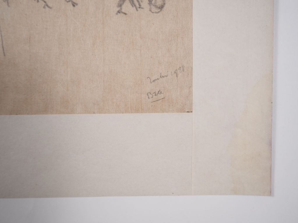 Louis Robert BATE (1898-1948, grand prix de l'Indochine en 1938). "Etude bœufs de rizières et de personnages du Tonkin". Dessin à la mine de plomb signé, situé et daté 1939 en bas à droite. Dim. 55 x 47 cm.