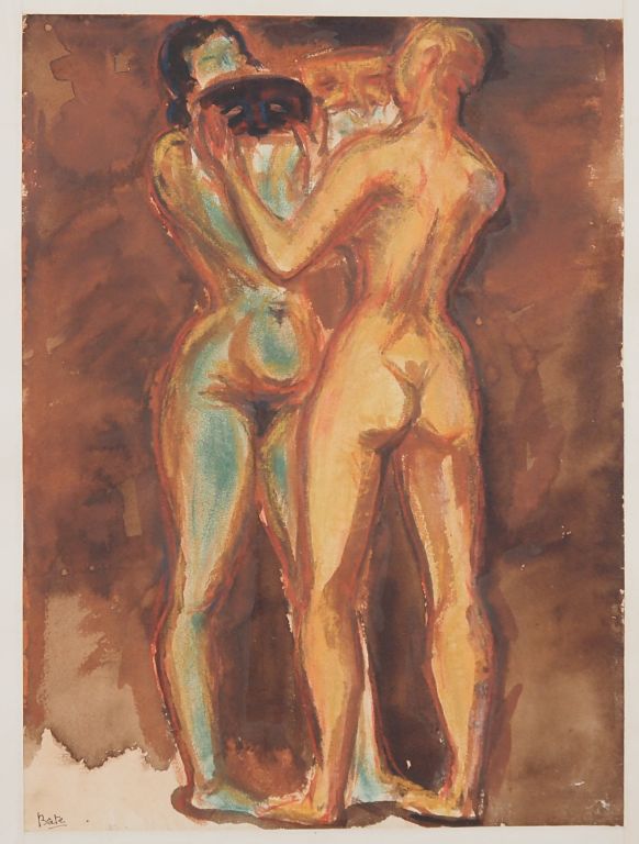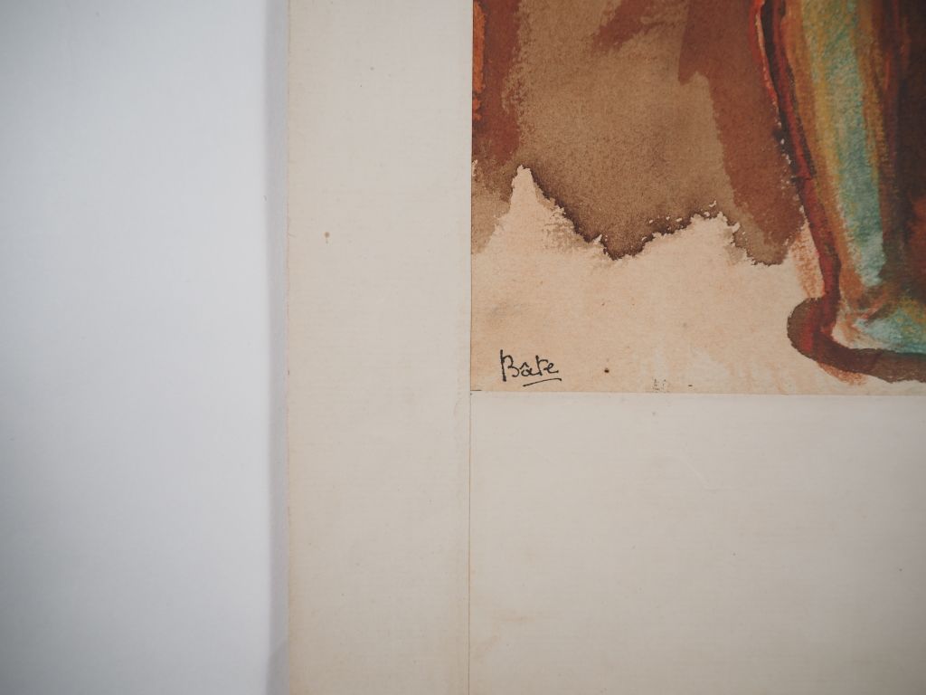 Louis Robert BATE (1898-1948, grand prix de l'Indochine en 1938). "Femmes asiatiques et masques". Aquarelle et couleurs sur papier signée en bas à gauche. Dim. 35 x 26 cm.