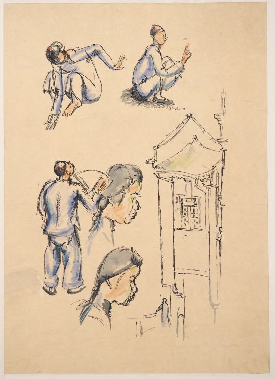 Louis Robert BATE (1898-1948, grand prix de l'Indochine en 1938). "Habitation et personnages chinois". Encre et couleurs sur papier. Dim. 27,5 x 19,5 cm.