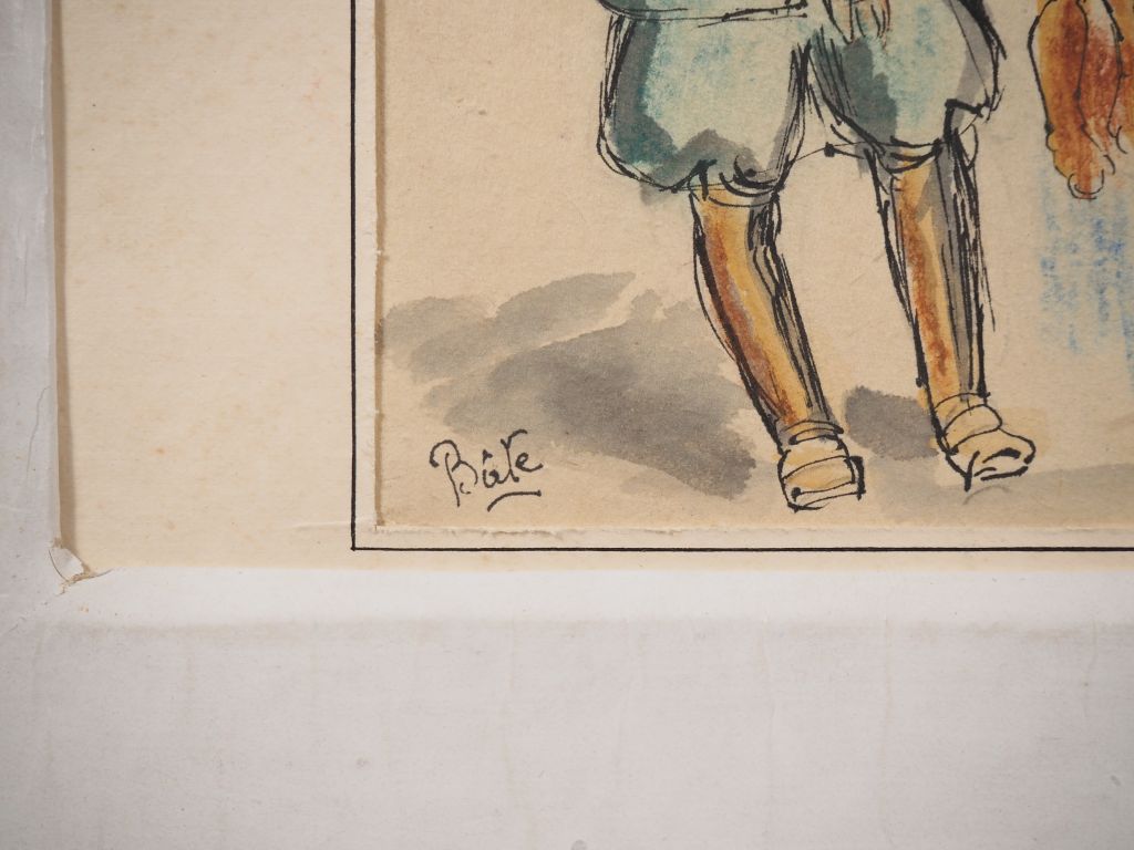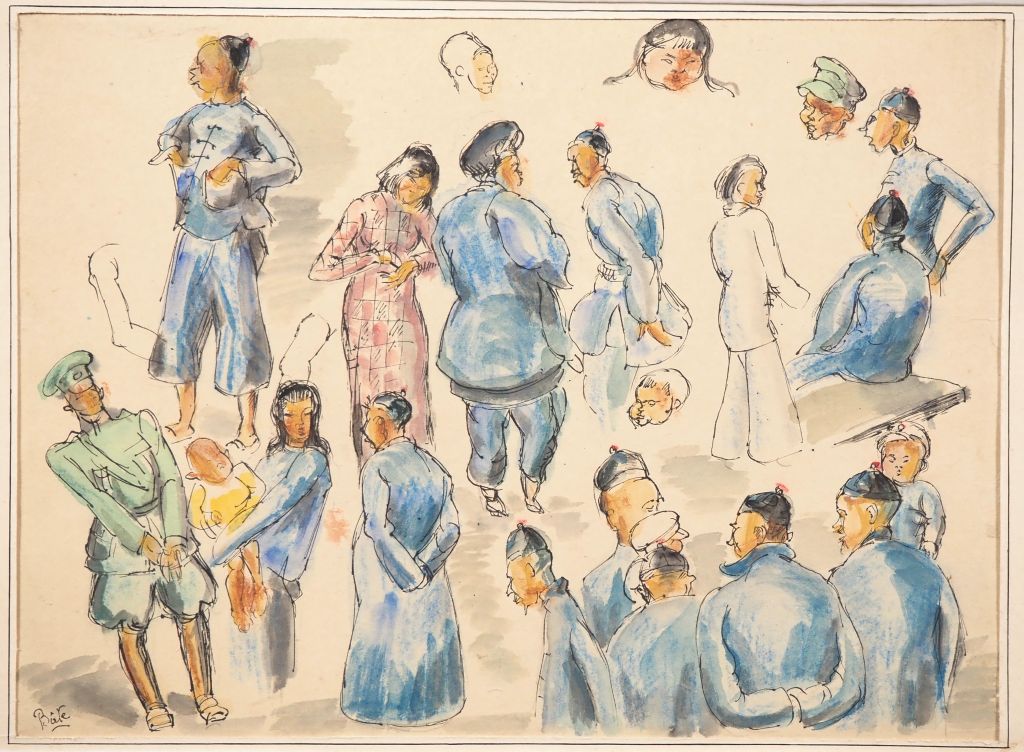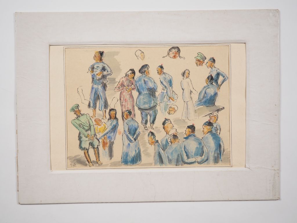 Louis Robert BATE (1898-1948, grand prix de l'Indochine en 1938). "Jeunes femmes, jeunes hommes, enfants et militaires". Encre et couleurs sur papier, signée en bas à gauche. Dim, 23 x 31 cm.