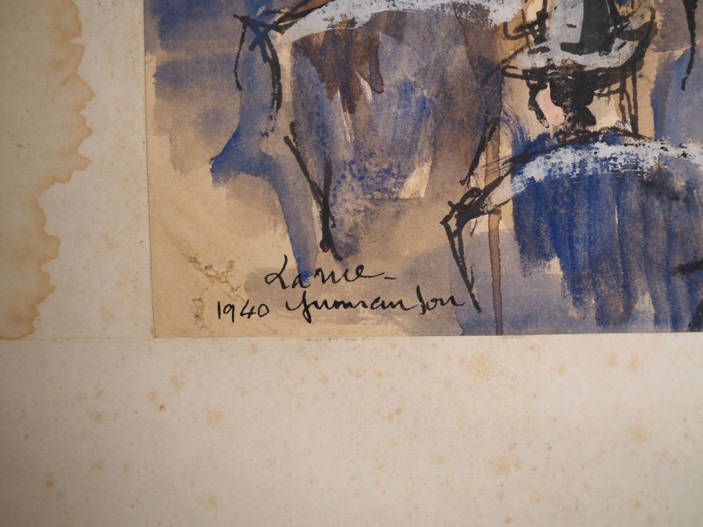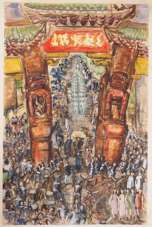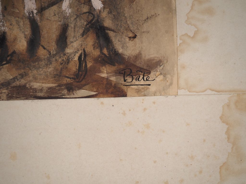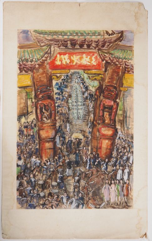 Louis Robert BATE (1898-1948, grand prix de l'Indochine en 1938). "La rue". Spectaculaire encre et aquarelle gouachée. Signée en bas à droite, située, titrée et datée 1940 en bas à gauche. Dim. 99 x 64 cm.