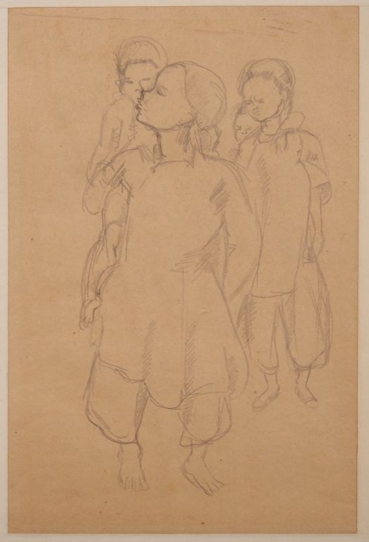 Louis Robert BATE (1898-1948, grand prix de l'Indochine en 1938). "Mères indochinoises portant leurs enfants". Dessin au crayon noir. Dim. 37,5 x 25 cm.