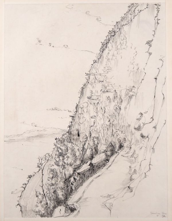 Louis Robert BATE (1898-1948, grand prix de l'Indochine en 1938). "Pagodes dans la montagne chinoise". Dessin à l'encre de Chine situé en bas à droite et daté 1941. Dim. 58 x 44 cm.
