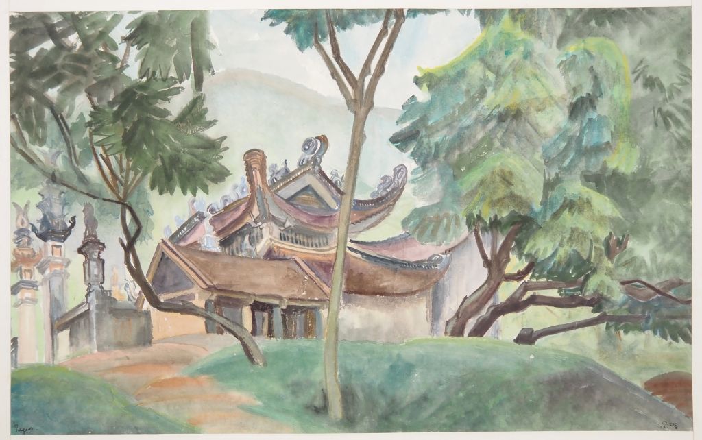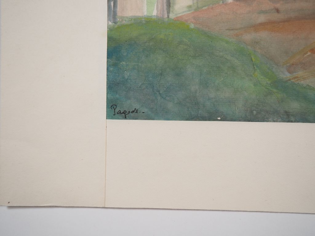 Louis Robert BATE (1898-1948, grand prix de l'Indochine en 1938). "Pagode". Aquarelle sur papier signée en bas à gauche. Dim. 30 x 48,5 cm.