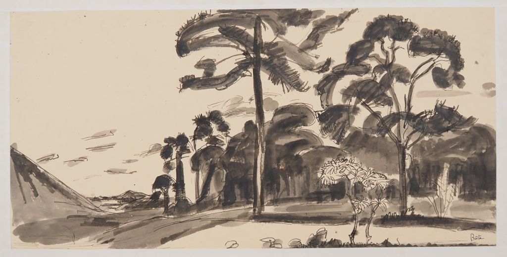 Louis Robert BATE (1898-1948, grand prix de l'Indochine en 1938). "Paysage arboré d'Asie du sud". Encre et aquarelle sur papier. Dim. 21,5 x 43,5 cm.