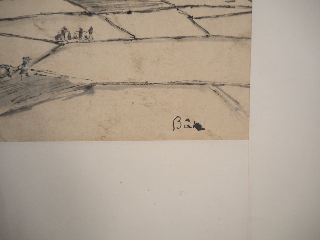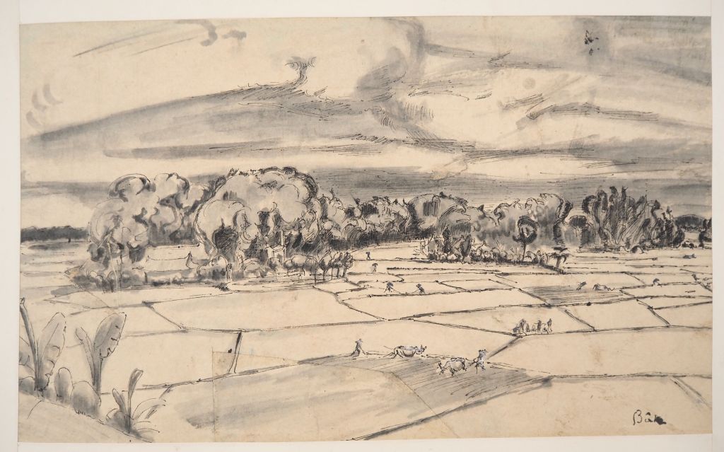 Louis Robert BATE (1898-1948, grand prix de l'Indochine en 1938). "Paysage de rizières animées". Encre et aquarelle sur papier signée en bas à droite. Dim. 19,5 x 33 cm.