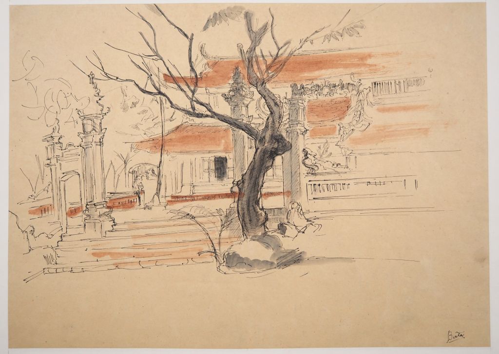 Louis Robert BATE (1898-1948, grand prix de l'Indochine en 1938). "Paysage et pagode". Encre et couleur sur papier signée en bas à droite. Dim. 30 x 42 cm.