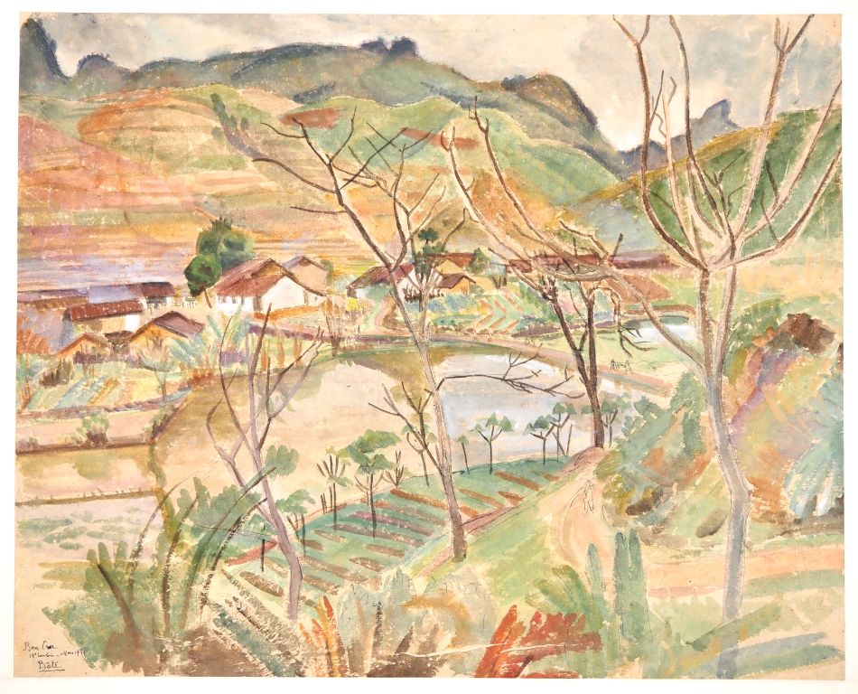 Louis Robert BATE (1898-1948, grand prix de l'Indochine en 1938). "Rizières à Rach Gia, Haut Tonkin mars 1939". Encre et couleurs sur papier signée, datée et située en bas à gauche. Dim. 45,5 x 56,5 cm. (Petites pliures).