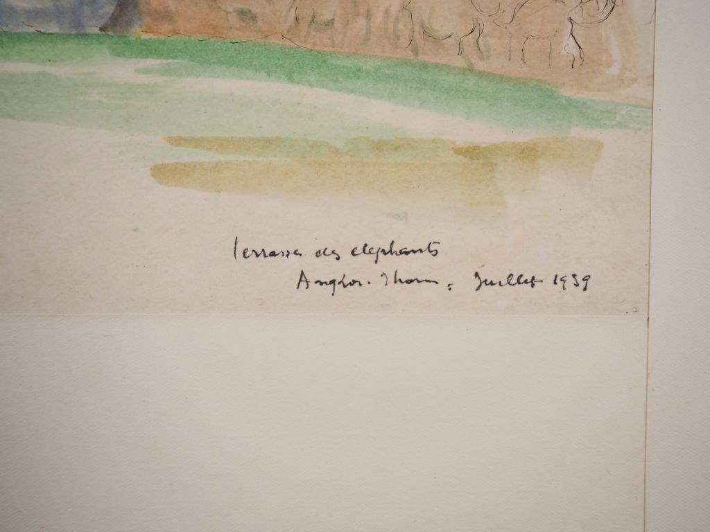 Louis Robert BATE (1898-1948, grand prix de l'Indochine en 1938). "Terrasse des éléphants, Angkor Thom juillet 1939". Encre et couleurs sur papier, signée en bas à gauche, titrée et datée en bas à droite. Dim. 30,5 x 40 cm.