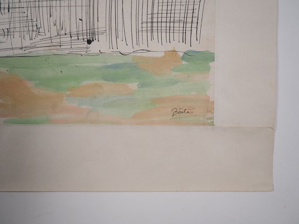 Louis Robert BATE (1898-1948, grand prix de l'Indochine en 1938)." "Villageois indochinois en bord de forêt". Encore et couleurs sur papier, signée en bas à droite. Dim. 48 x 67,5 cm.