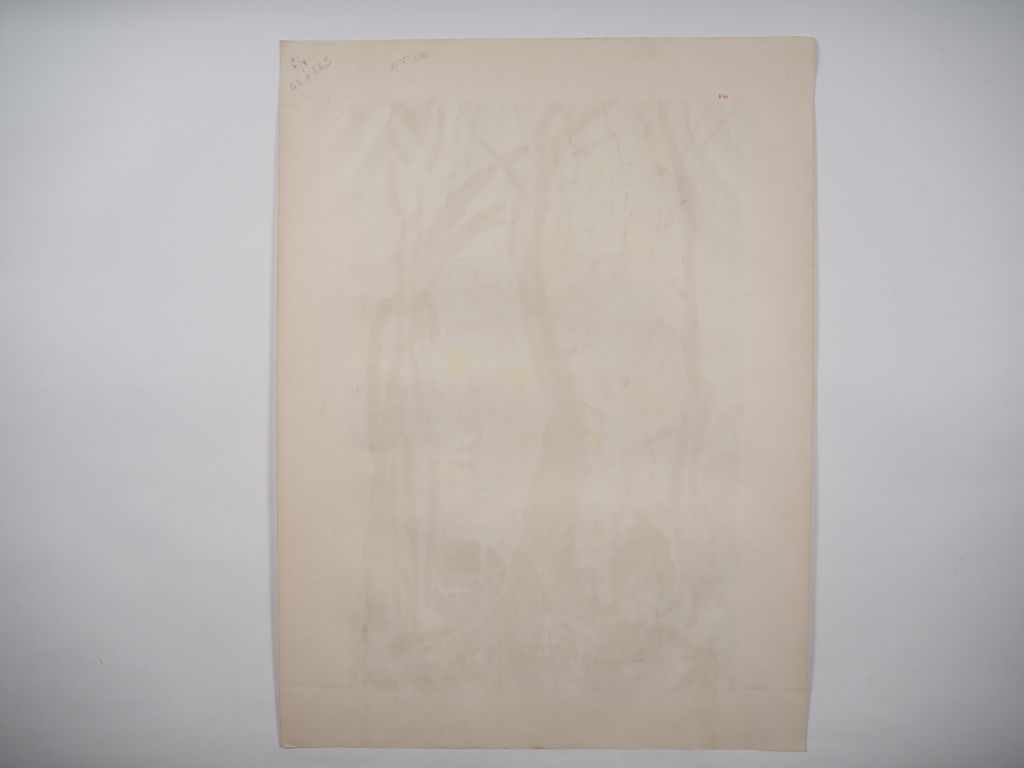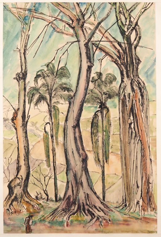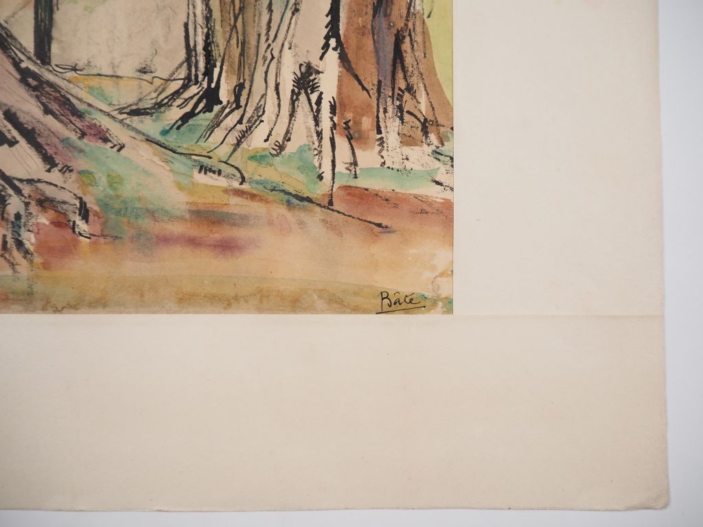 Louis Robert BATE (1898-1948, grand prix de l'Indochine en 1938). "Vue des rizières depuis la lisière de la forêt". Aquarelle signée en bas à droite. Dim. 64 x 42 cm.
