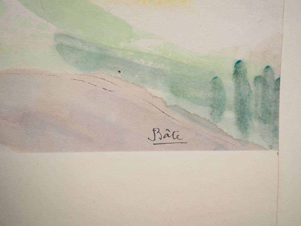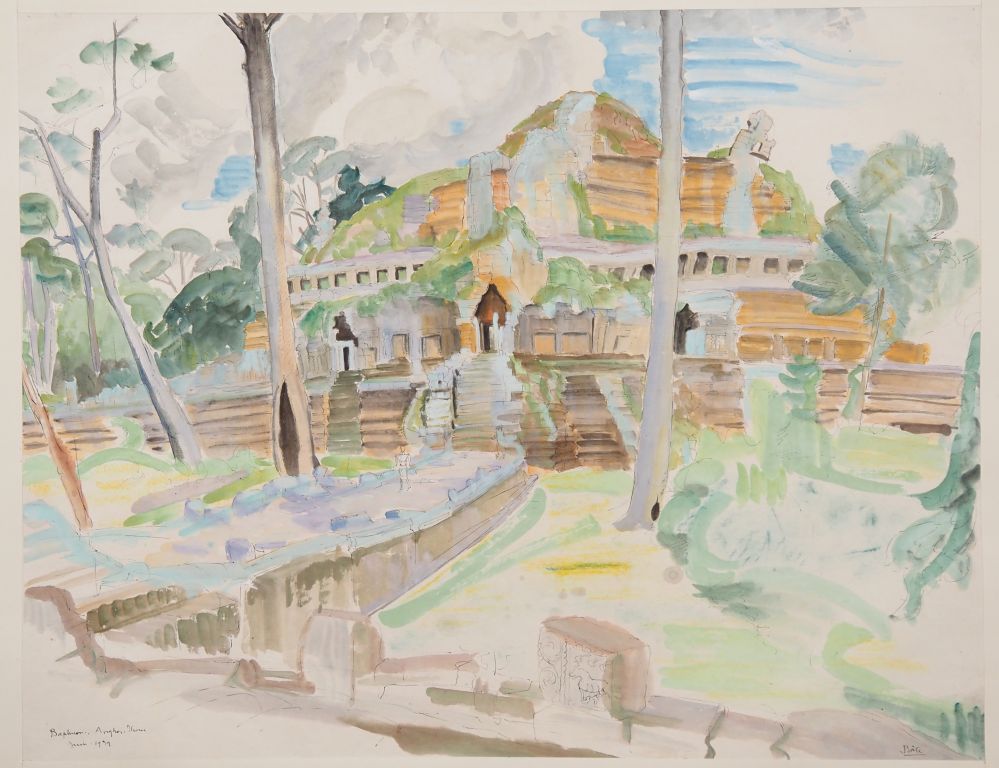 Louis Robert BATE (1898-1948, grand prix de l'Indochine en 1938). "Vue d'Angkor Thom, Angkor". Encre et couleur sur papier, signée et située en bas à droite, datée 1939. Dim. 48,5 x 62 cm.