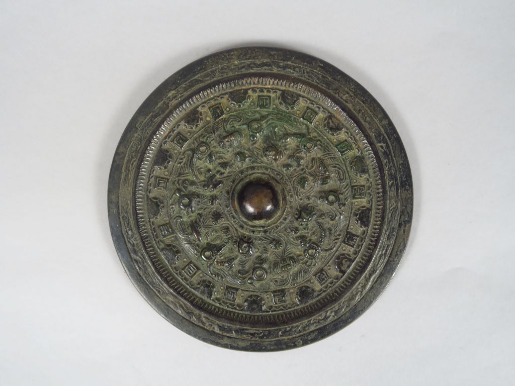 Miroir circulaire en bronze, de belle patine. Chine, fin de l'époque Ming, XVIIème siècle. Diam. 17,7 cm.