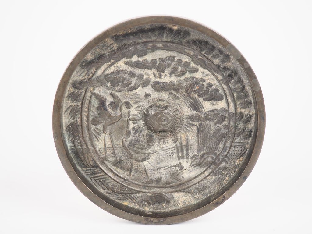 Miroir en bronze à décor d'échassier sous des pins de longévité. Chine XIXème Diam. 11 cm. ²