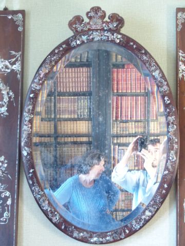 Miroir indochinois ovale en marqueterie de nacre et bois exotique, à décor de fleurs, d'insectes et d'oiseaux. XIXème. 89 x 60 cm