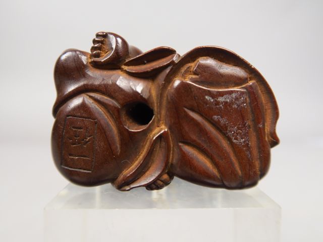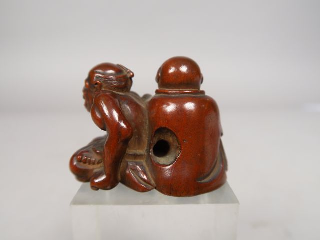 Netsuke en bois représentant un aveugle pratiquant un amma, massant le bras d’un borgne, tous deux assis au sol. Signé Kazuyuki. Japon, XVIIIe-début XIXe siècle. (Un himotoshi agrandi) Haut. 3,7 cm – Long. 4,5 cm.
