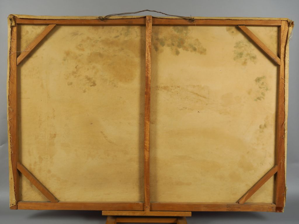 Nguyen Mai Thu "Buffles au milieu d'une rivière traversant un village entouré de pics montagneux" Huile sur toile. Signée en bas à droite et datée 1934. 70 x 98 cm