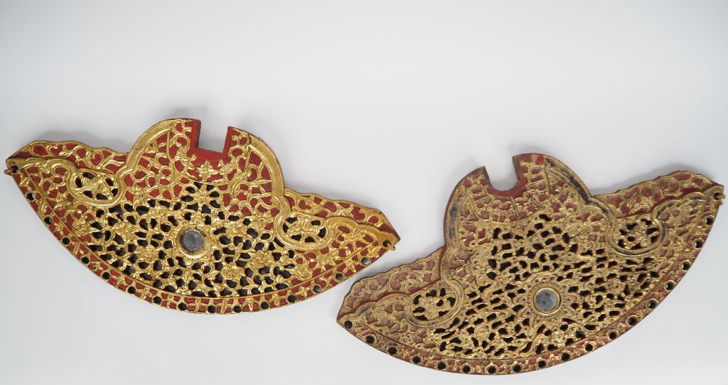 Ningbo vers 1900, Deux éléments de mobiliers, en bois laqué rouge et or, reprenant la forme d'une chauve souris stylisée à décor ajouré de rinceaux feuillagés. Dim. 33 x 69 cm et 36 x 69 cm (bois fendu sur un des éléments)