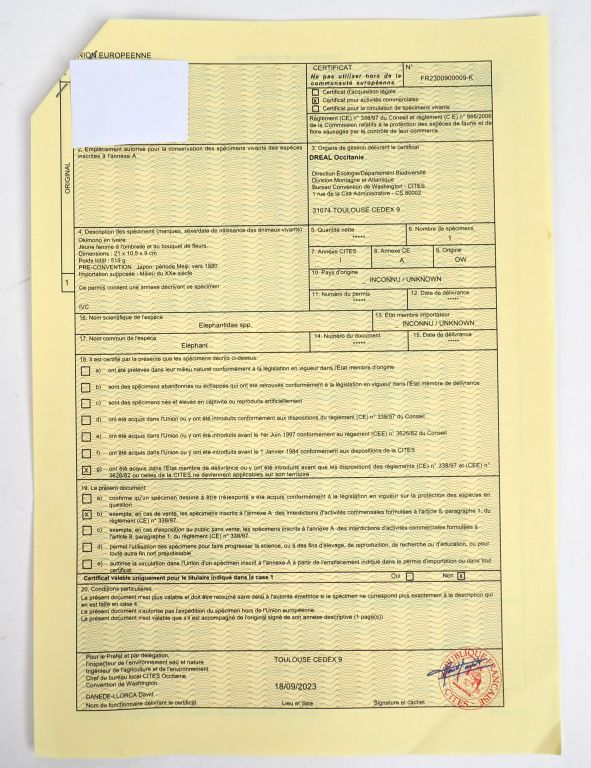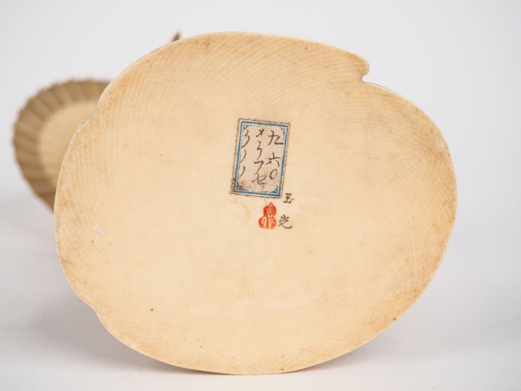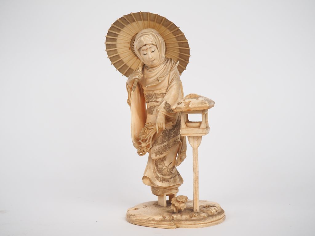 Okimono en ivoire Jeune femme à l'ombrelle et au bouquet de fleurs. Elephantidae spp Dimensions. 21 x 10,5 x 9 cm. Poids total : 519 g Pré convention : Japon période Peiji, vers 1880. Importation supposée : milieu Xxème Un certificat CIC délivré par la DREAL occitanie sera délivré avec la pièce.