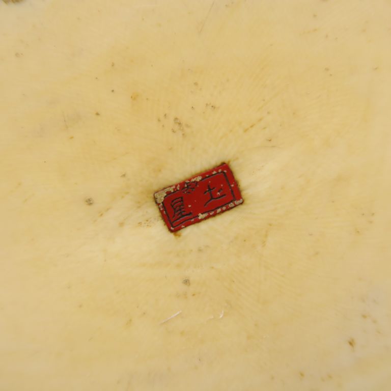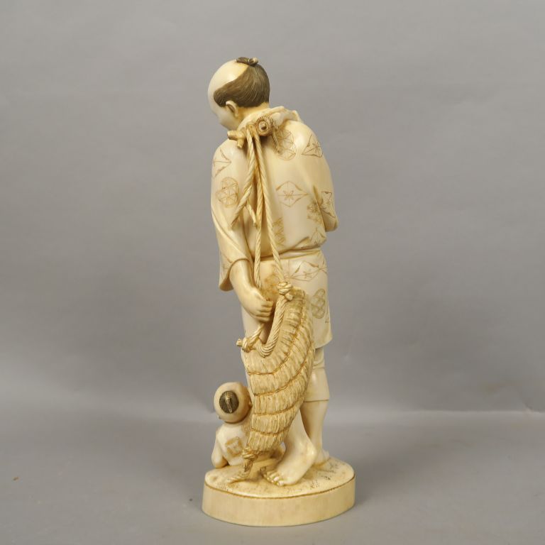 Okimono en ivoire représentant un paysan portant une besace, regardant son fils qui vient de tomber. Signé dans un cachet rouge. Japon, vers 1920. H. 32 cm Poids. 1661 gr Nom scientifique de l’ivoire : ivoire d’éléphant Elephantidae spp (I/A, pré-convention), spécimen antérieur au 1er juin 1947 et conforme à la réglementation CE 338/97 du 09/12/1996, art. 2-W mc. Pour une sortie de L’UE, un CITES de ré-export sera nécessaire, celui-ci étant à la charge de l’acquéreur.